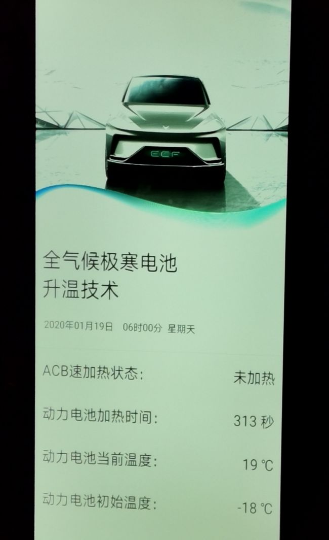 測(cè)試從凌晨5:30開(kāi)始,此時(shí)溫度計(jì)顯示當(dāng)?shù)貧鉁爻^(guò)零下-30度,無(wú)論是技術(shù)人員、工作人員,還有參加活動(dòng)的媒體記者都全副武裝穿上了厚重的棉服羽絨服。此時(shí)北汽新能源和北汽福田的測(cè)試車(chē)輛在順利成功啟動(dòng)后一直保持穩(wěn)定運(yùn)行,電池系統(tǒng)以7℃/min持續(xù)升溫,直至電池正常的工作溫度20°。從而確保整車(chē)?yán)m(xù)航里程與正常環(huán)境下基本匹配。整個(gè)挑戰(zhàn)試驗(yàn)過(guò)程相當(dāng)順利,挑戰(zhàn)成功。