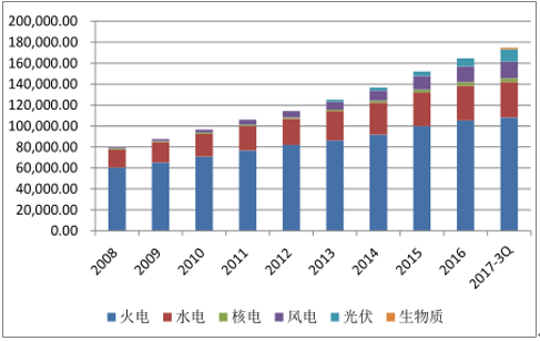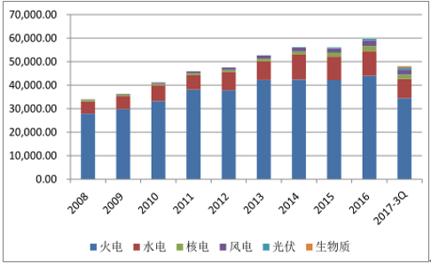 截止到2017年三季度末,我國煤電裝機10.81億千瓦,水電3.39億千瓦,核電3582萬千瓦,風(fēng)電1.57億千瓦,光伏1.2億千瓦,生物質(zhì)1423萬千瓦;火電裝機占全部裝機容量的61.87%,水電裝機占19.4%,核電占2.05%,風(fēng)電占9.0%,光伏占6.87%,生物質(zhì)占0.81%。從發(fā)電量來看,2017年前三季度,我國煤電發(fā)電3.45萬億度,水電8147億度,核電1834億度,風(fēng)電2128億度,光伏857億度,生物質(zhì)568億度。煤電發(fā)電量占比高達(dá)71.84%,水電占16.95%,核電占3.82%,風(fēng)電占4.43%,光伏占1.78%,生物質(zhì)占1.18%。