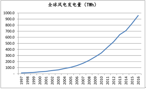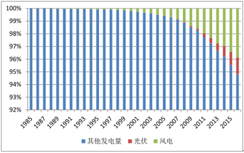 2016年,全球風(fēng)電發(fā)電量在總發(fā)電量中的占比為3.87%,光伏占比為1.34%,二者合計僅為5.2%。但風(fēng)電和光伏由于擁有清潔環(huán)保的優(yōu)勢,以及較大的成本下降潛力,未來的發(fā)展空間不可限量。